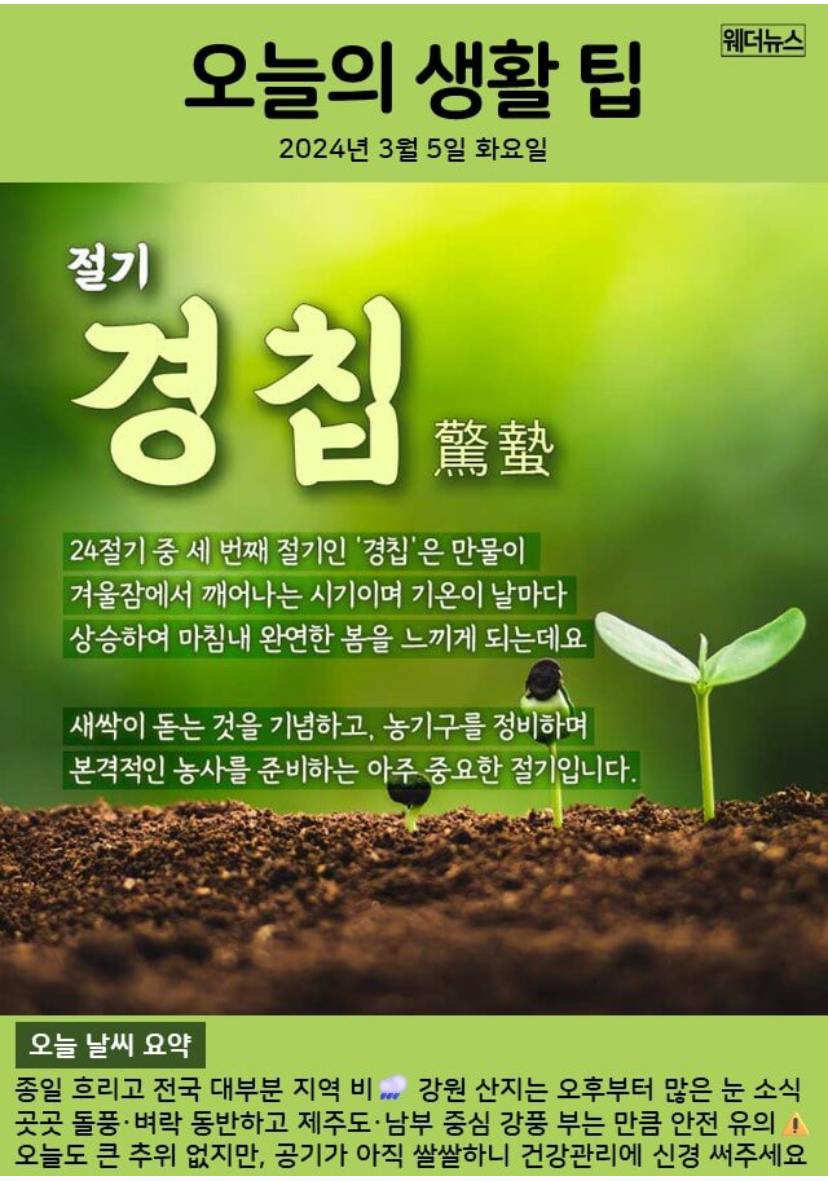 蟄)인 오늘, 전국 대부분 지역에 비가