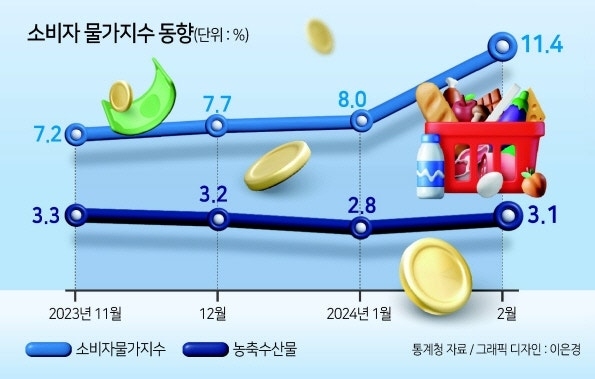 ▼농산물 물가가 끌어올린 물가. 과일등 농산물 물가는 20.9%, 전체 농수축산물 물가는 11,4% 올라