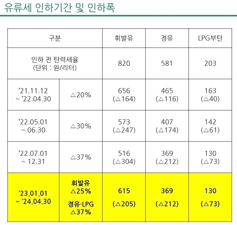 → 유류세 인하, 2021년 11월 이후 29개월 동안 8차례에 연장, 올 4월 종료.