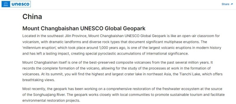 → 유네스코 집행이사회, 중국명 ‘창바이(長白)산’으로 유네스코 세계지질공원에 지정.