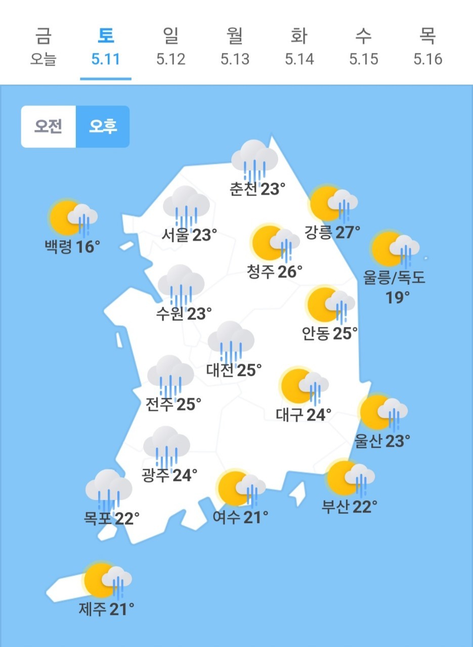 ✫춘천(⛅)➠(☔) 11℃ ~ 23℃