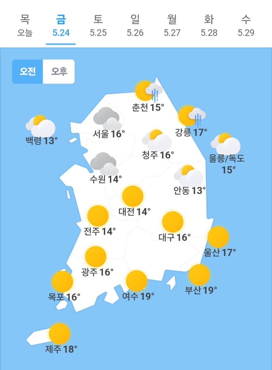 ✫춘천(🌦)➠(☁️) 15℃ ~ 24℃