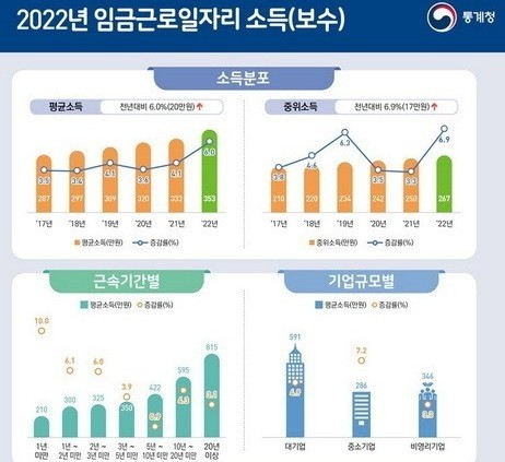 → 2022년 12월 기준 대기업 근로자의 월평균 소득은 591만원(세전 기준)으로 중소기업 286만 원보다 2배 넘게 많았다.