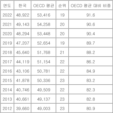 → 2022년 기준 한국 근로자 평균임금은 6681만원(4만8900달러)으로 38개 회원국 중 중간인 19위, 일본은 25위 수준인 4만 1509달러로, 한국이 일본의 1.2배.(문화)