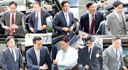 국내 주요 그룹 총수들이 무함마드 빈 자이드 알나하얀 아랍에미리트(UAE) 대통령을 만나기 위해 28일 서울 소공동 롯데호텔에 들어서고 있다. 왼쪽 상단부터 시계 방향으로 이재용 삼성전자 회장, 최태원 SK그룹 회장, 정기선 HD현대 부회장, 허태수 GS그룹 회장, 이재현 CJ그룹 회장, 조만호 무신사 총괄대표, 방시혁 하이브 의장, 조현준 효성그룹 회장, 김동관 한화그룹 부회장, 김택진 엔씨소프트 대표. 김범준 기자