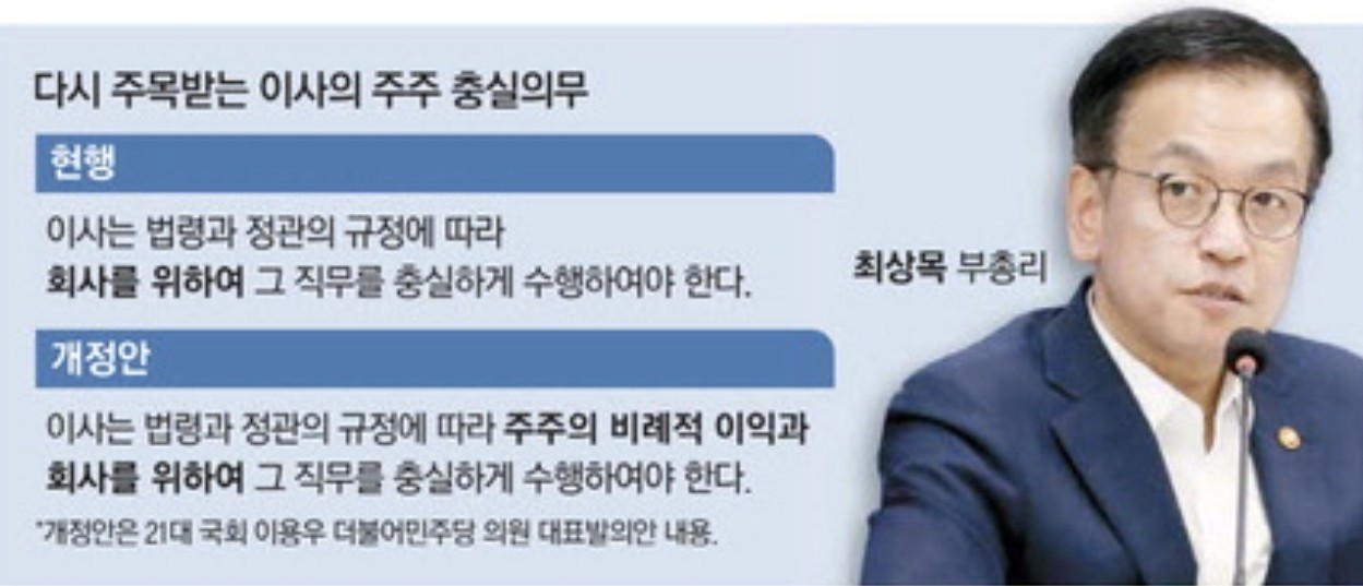 4. 최상목 경제부총리 겸 기획재정부 장관과 이복현 금융감독원장이 주주이익에 대한 이사의 충실의무를 도입해야 한다고 한 목소리를 냈습니다.