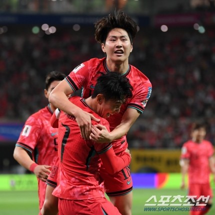손흥민이 선취골을 넣은 이강인과 함께 환호하고 있다. 상암=박재만 기자