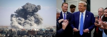 지난달 가자지구 남부 라파에서 이스라엘군의 공습으로 검은 연기가 피어오르고 있다. 오른쪽은 도널드 트럼프 전 미국 대통령. AFP·로이터연합뉴스