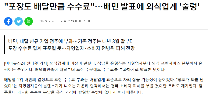 배달전문 분식점에서 '마라로제 떡볶이 세트(1만 7000원)'를 한 달에 1000건 판매할 때 기존 요금제(울트라콜) 사용 시 한달 282만 5000원, 신규 요금제(배민플러스)로 변경하면서 513만 2600원까지 불어나.(아시아경제)