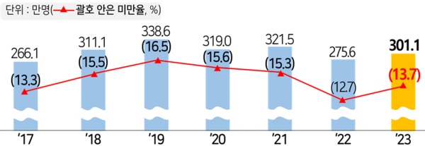 2017년 이후 최저임금액 미만 근로자 수 및 미만율 추이 [자료=통계청, 경제활동인구조사 근로형태별 부가조사(8월) 원자료, 각연도]