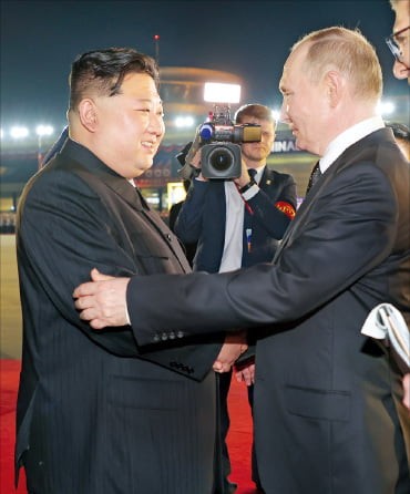전날 블라디미르 푸틴 러시아 대통령이 방북 일정을 마친 뒤 김정은 북한 국무위원장과 악수하고 있다. /공군 제공·뉴스1