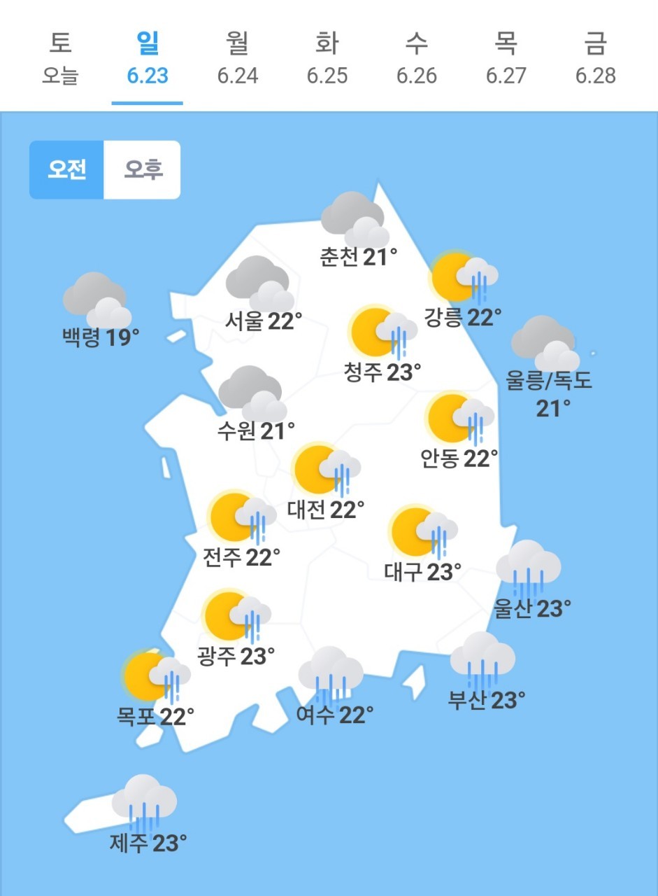 | 오늘의🌞☔️☃️ 날씨, 2024년 6월 22일 토요일 (0) | 2024.06.22 |