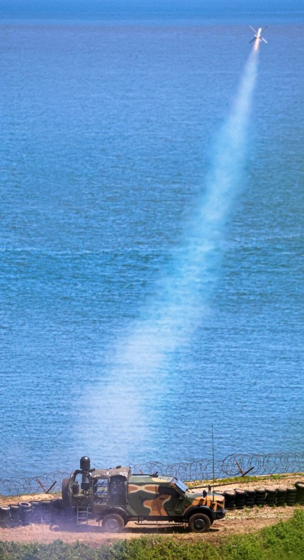 서북도서방위사령부 예하 해병부대원들이 26일 인천광역시 옹진군 대연평도에서 열린 해상사격훈련에서 스파이크 대전차 미사일을 발사하고 있다. 군은 이날 훈련에서 K9 자주포, 천무 다연장로켓, 스파이크 미사일 등 총 290여 발을 발사하며 북한을 향해 경고성 메시지를 보냈다. 군이 9·19 남북 군사합의로 중단됐던 서북도서 정례 해상사격훈련을 재개한 것은 2017년 8월 이후 약 7년 만이다. <연합뉴스>