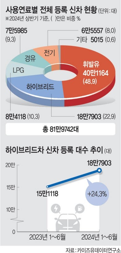 → 올 상반기 등록 신차 중 하이브리드가 22.9%로 휘발유차(48.9%)에 이어 2위.