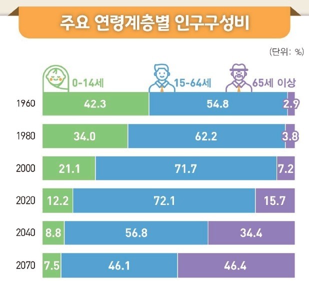 이대로 가면 한국에서 노인 1명을 부양하는 생산가능인구는 현재 4~5명에서 40여년 후 1명으로 줄어드는 역사상 어느 나라에서도 일어나지 않았던 충격이 한국을 덮칠 것...(아시아경제)