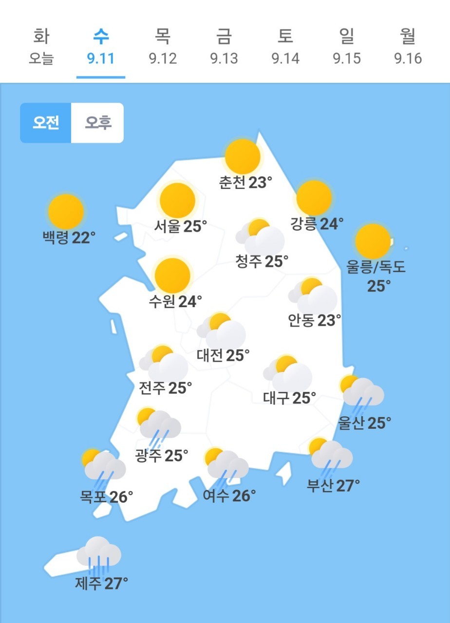 ✫청주(⛅)➠(⛈) 25℃ ~ 34℃-
