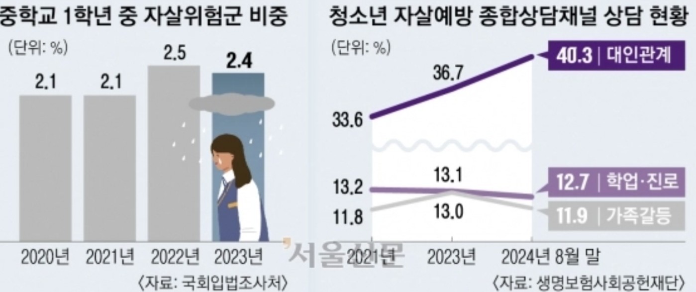 → 초등학교 4학년부터 학업 스트레스와 수면 부족 등으로 정신건강에 적신호가 켜지고 중학교 1학년이 되면 자살 시도율 최고.