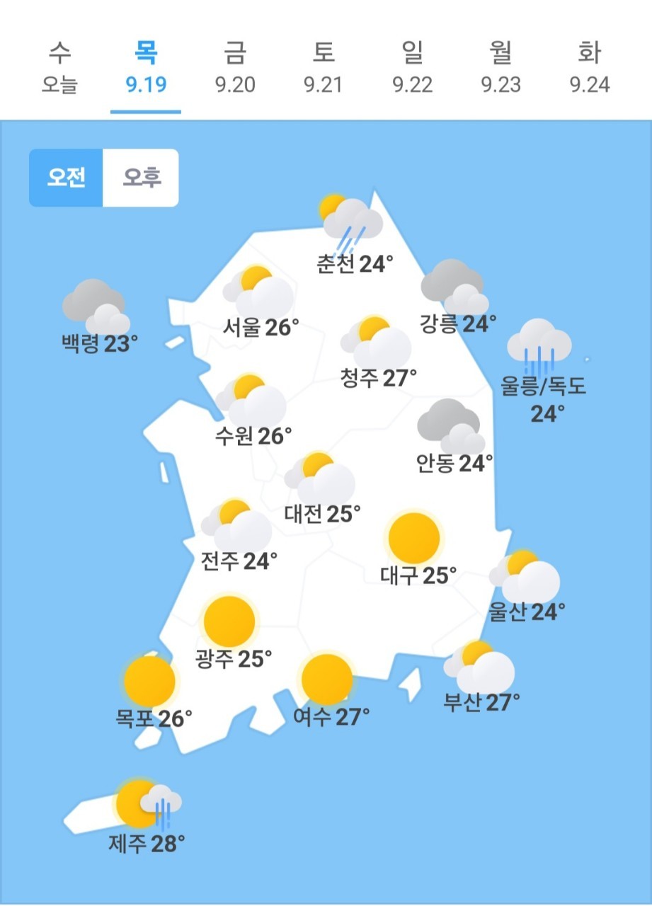 | 오늘의🌞☔️☃️ 날씨, 2024년 9월 18일 수요일 (0) | 2024.09.18 |