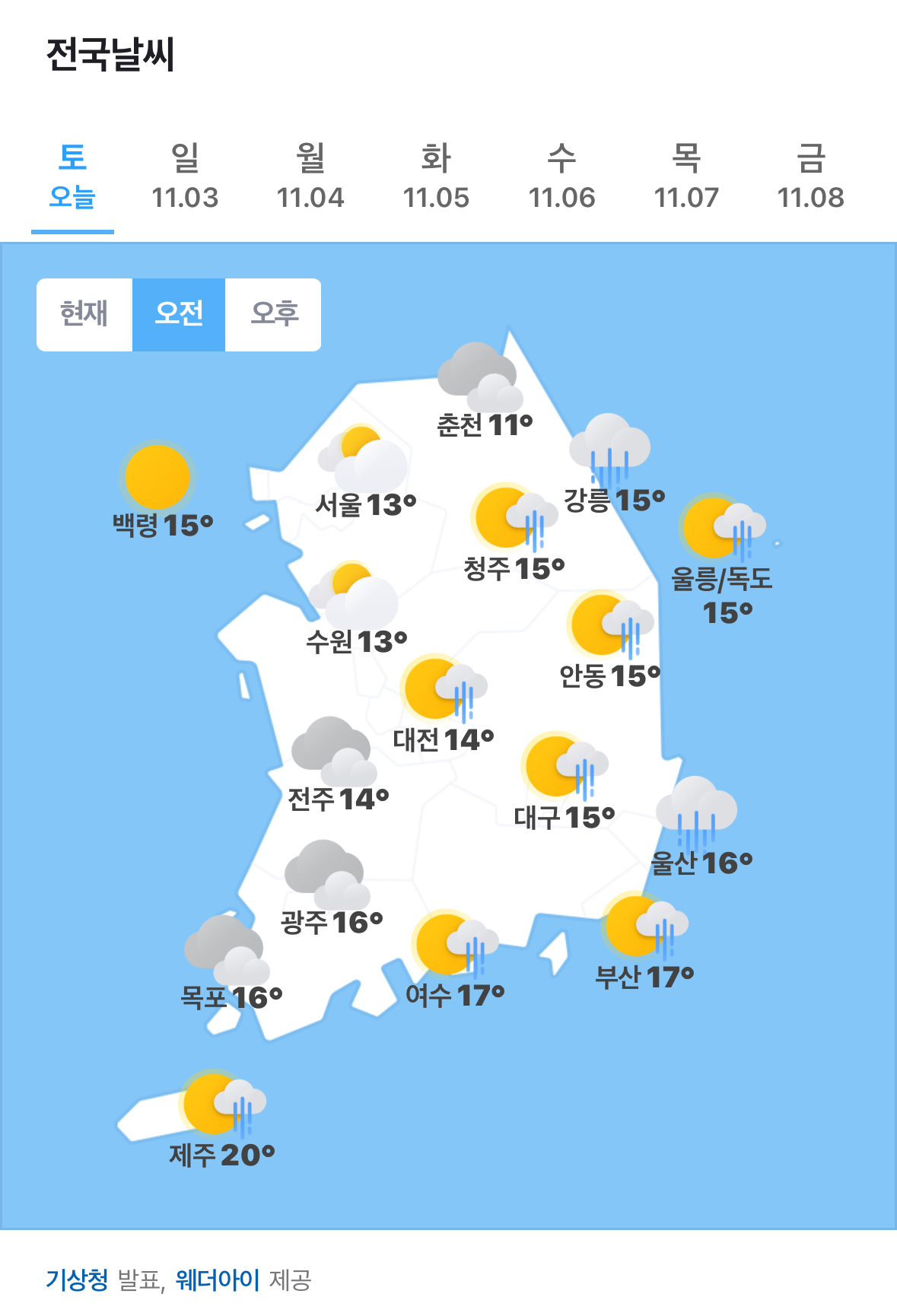 ✫춘천(☁️)➠(⛅) 11℃ ~ 20℃