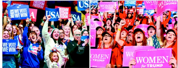 사진은 펜실베이니아주 앨런타운에서 열린 민주당 유세에서 해리스 부통령 지지자들이 환호하고 있는 모습(왼쪽)과 같은 날 펜실베이니아주 레딩에서 열린 공화당 유세 현장에서 ‘트럼프를 지지하는 여성들(Women for Trump)’이라고 쓰인 플래카드를 쓴 여성 지지자들이 환호하고 있는 모습. <로이터AFP연합뉴스>