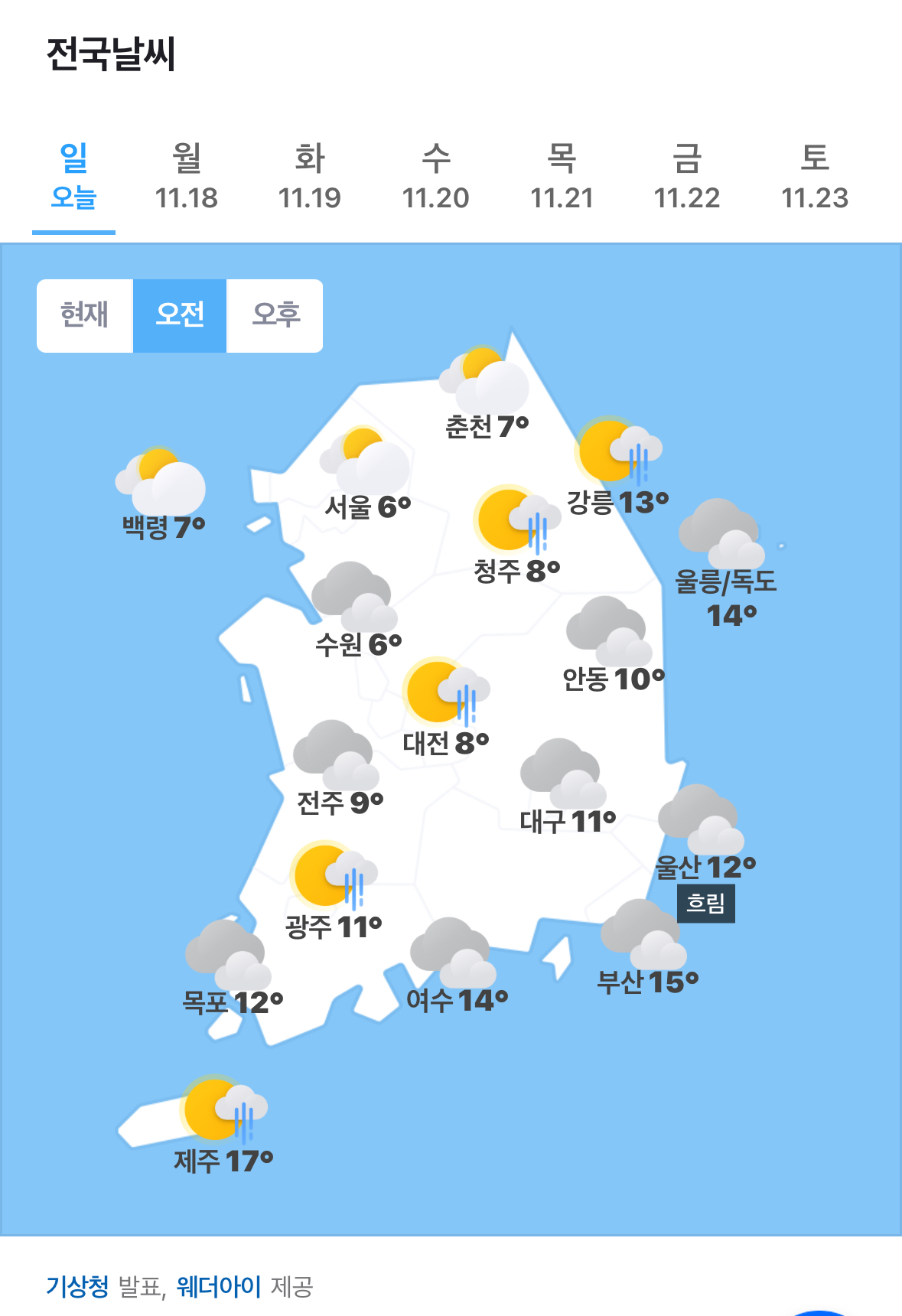 ✫제주(🌧)➠(⛅) 15℃ ~ 16℃