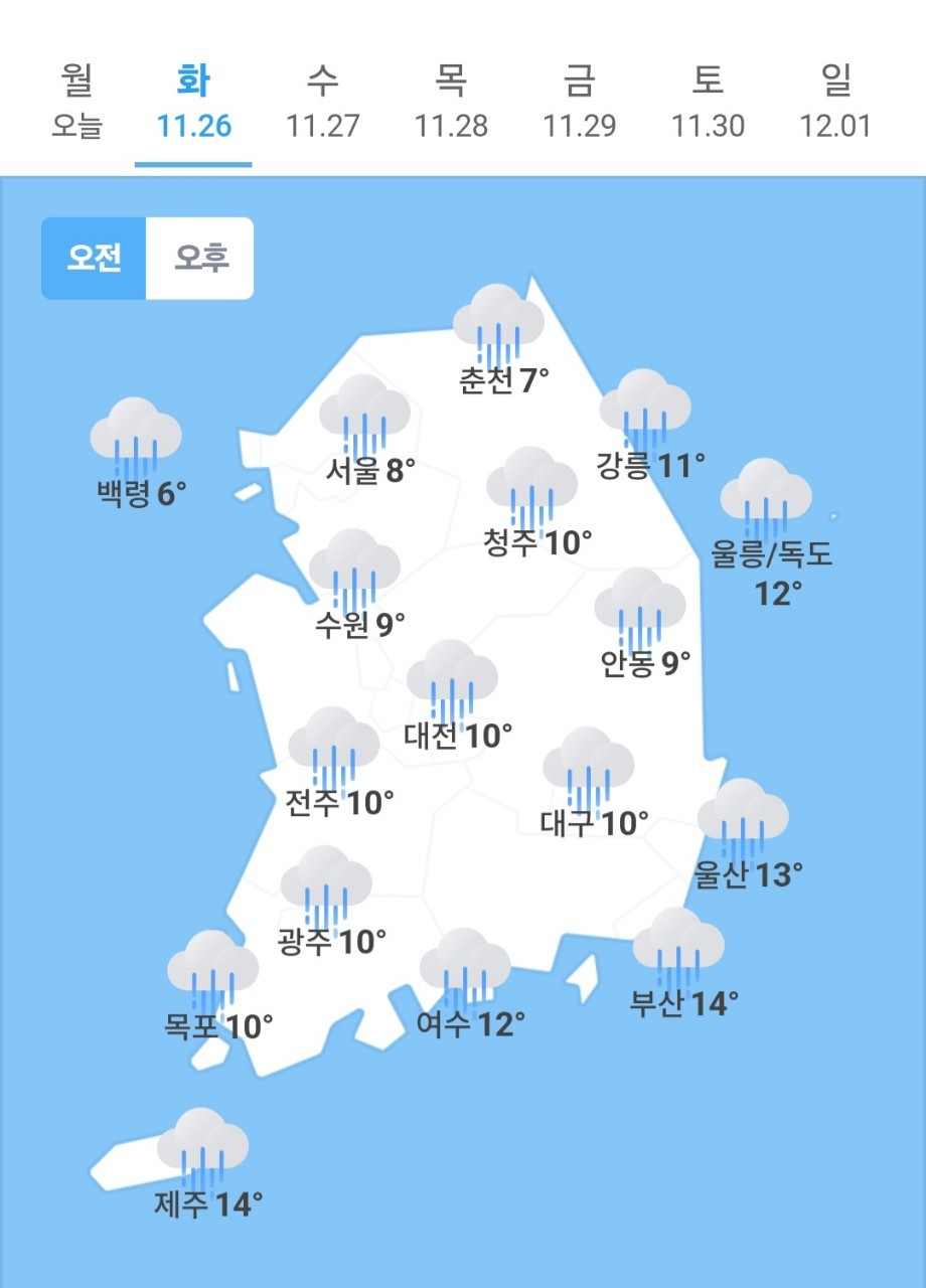 ✫대전(☔)➠(🌧) 10℃ ~ 12℃