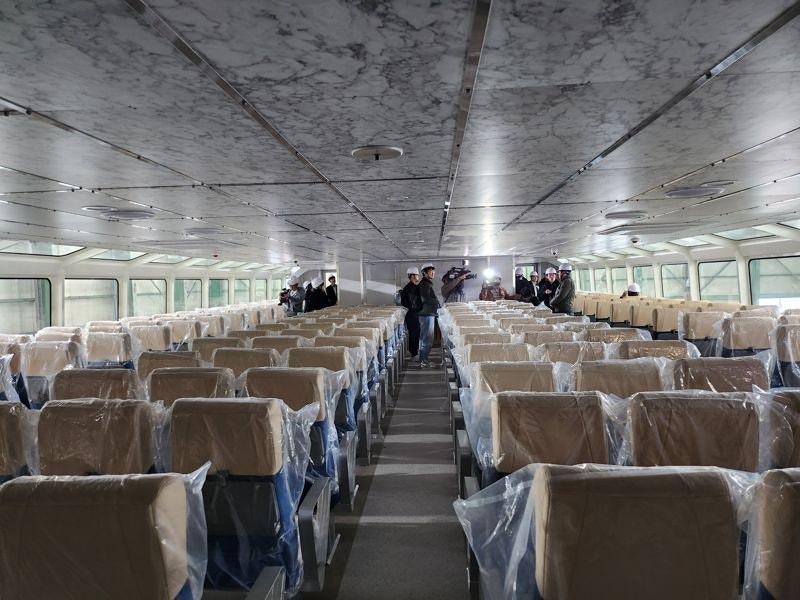 ▼내년 한강에서 운행될 수상 버스 내외부. 좌우 양쪽 배를 이은 ‘쌍동선’ 형태로 199석