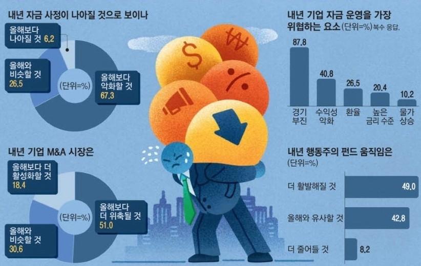 4. 대기업 10곳 중 7곳은 내년 자금 사정이 올해보다 더 나빠질 것으로 전제하고 경영계획을 수립하는 것으로 나타났습니다.