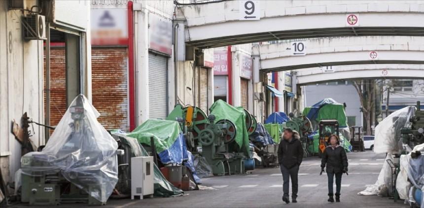 < 안 팔리는 중고기계만 덩그러니 > 경기 시흥 시화기계유통단지에 밀집한 상가마다 팔리지 않은 대형 중고 기계들이 방수 천막에 씌워진 채 방치돼 있다. 썰렁한 거리를 지나는 행인이 기계들을 쳐다보고 있다. /임형택 기자