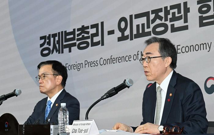 18일 서울 중구 프레스센터에서 열린 외신 대상 합동 기자회견에서 최상목 경제부총리 겸 기획재정부 장관(왼쪽)과 조태열 외교부 장관이 발언하고 있다. 이날 두 장관은 탄핵 정국에도 불구하고 한국의 대외신인도에는 영향이 없을 것이라고 강조했다. <이충우 기자>