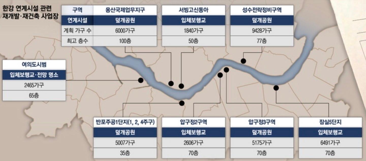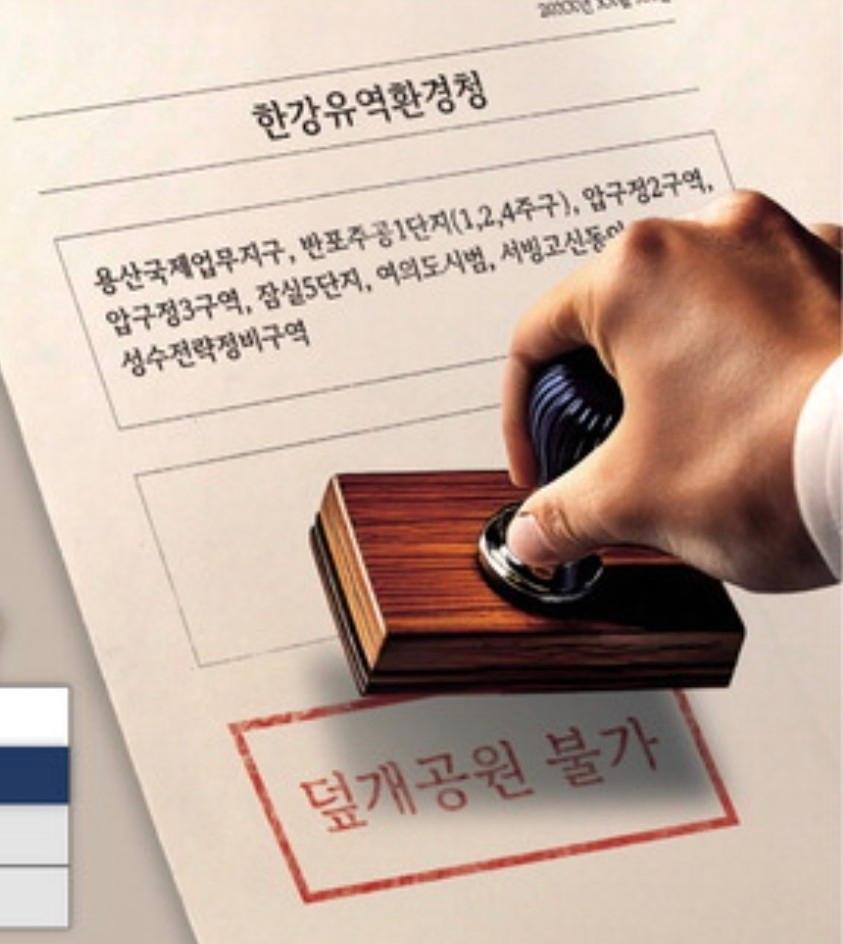 상당 수 단지들이 한강변과 연결되는 덮개공원과 입체보행교 조성을 조건으로 인허가를 받았는데, 한강유역환경청(한강청)이 뒤늦게 설치에 반대하고 나섰습니다.