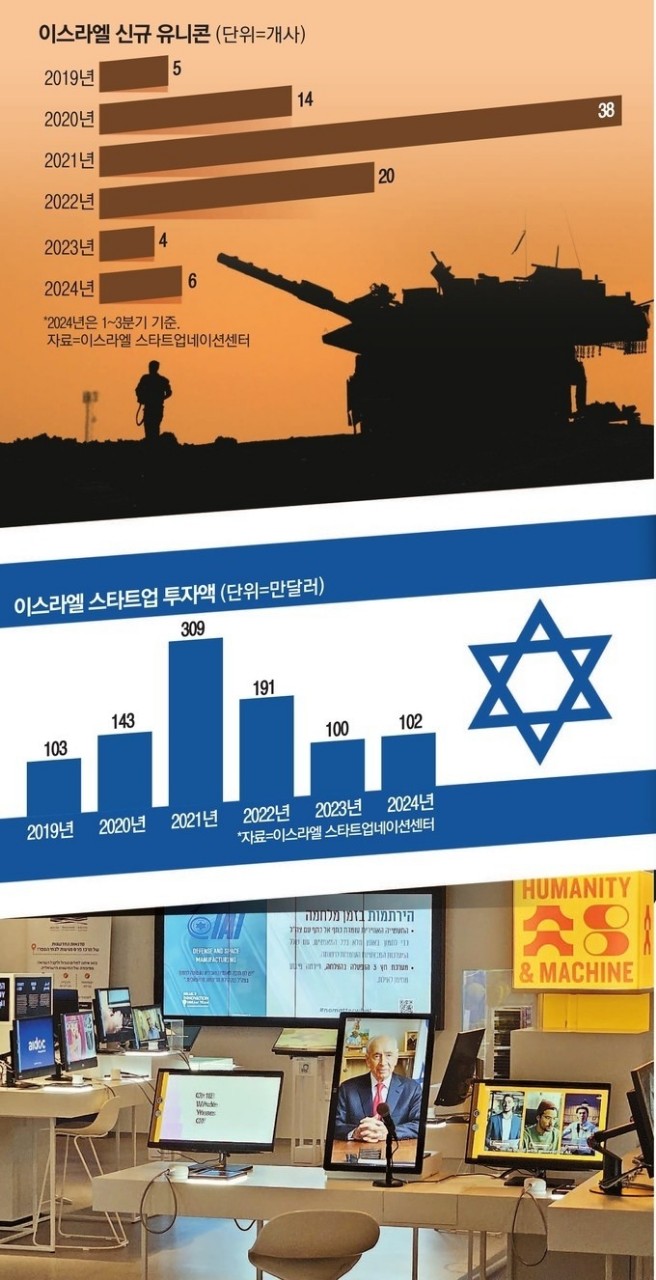 이스라엘 텔아비브에 위치한 페레스 혁신센터에 꾸려진 스타트업 홍보 전시관. 지난해 10월부터 전쟁을 벌이고 있는 이스라엘에선 유니콘 기업이 10개 늘어났다.