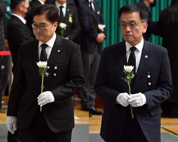 오른쪽 사진은 같은 장소를 찾아 헌화 중인 최상목 대통령 권한대행 부총리 모습. 무안=최현규 기자