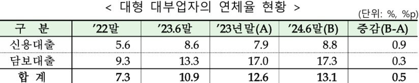 → 올 상반기 대형 대부업자의 30일 이상 원리금 연체율은 13.1%로 역대 최고.