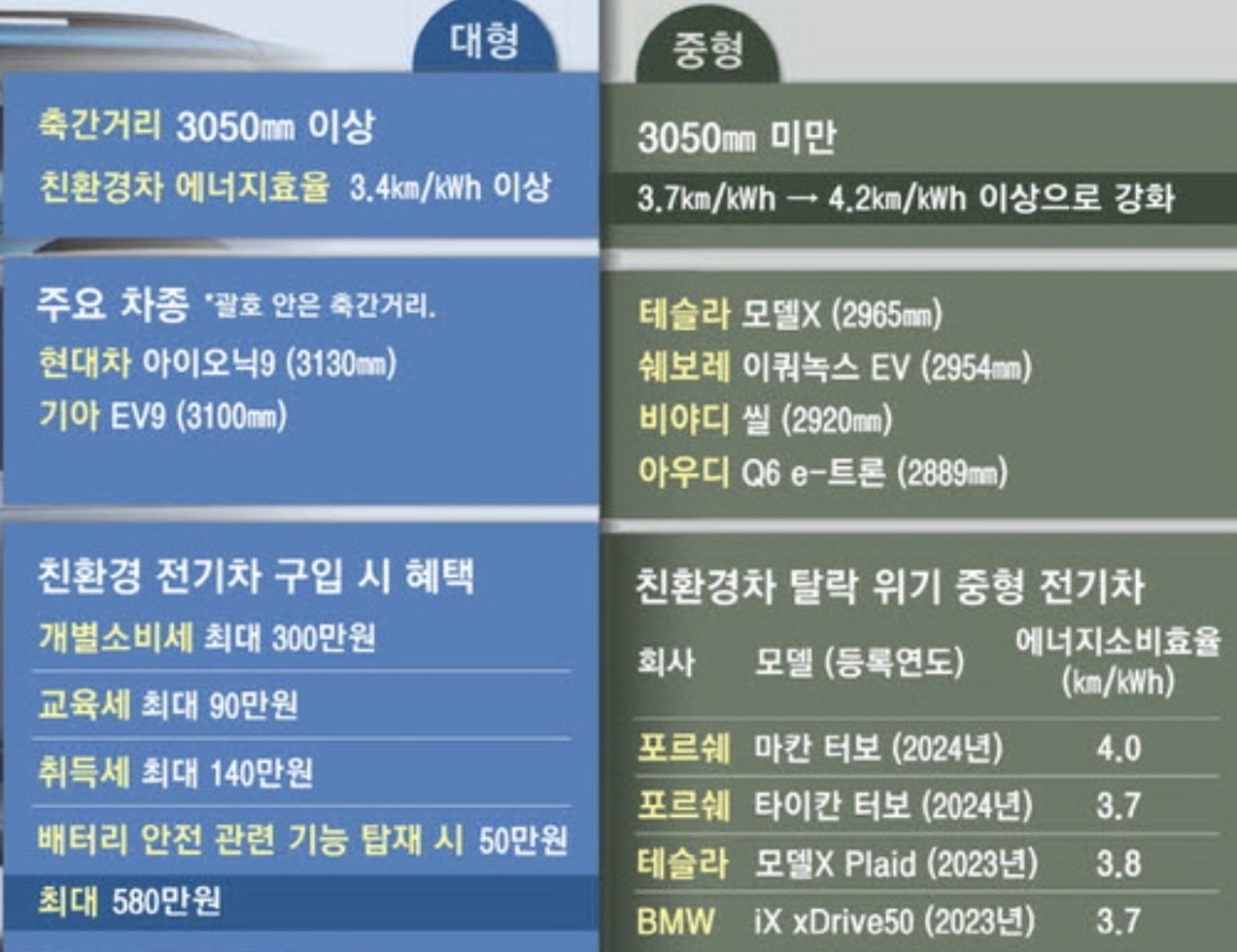 1. 정부가 대형 전기승용차에 대한 친환경 인증 기준을 완화해 전기차 소비자들의 세제혜택 문턱을 낮추기로 했습니다.