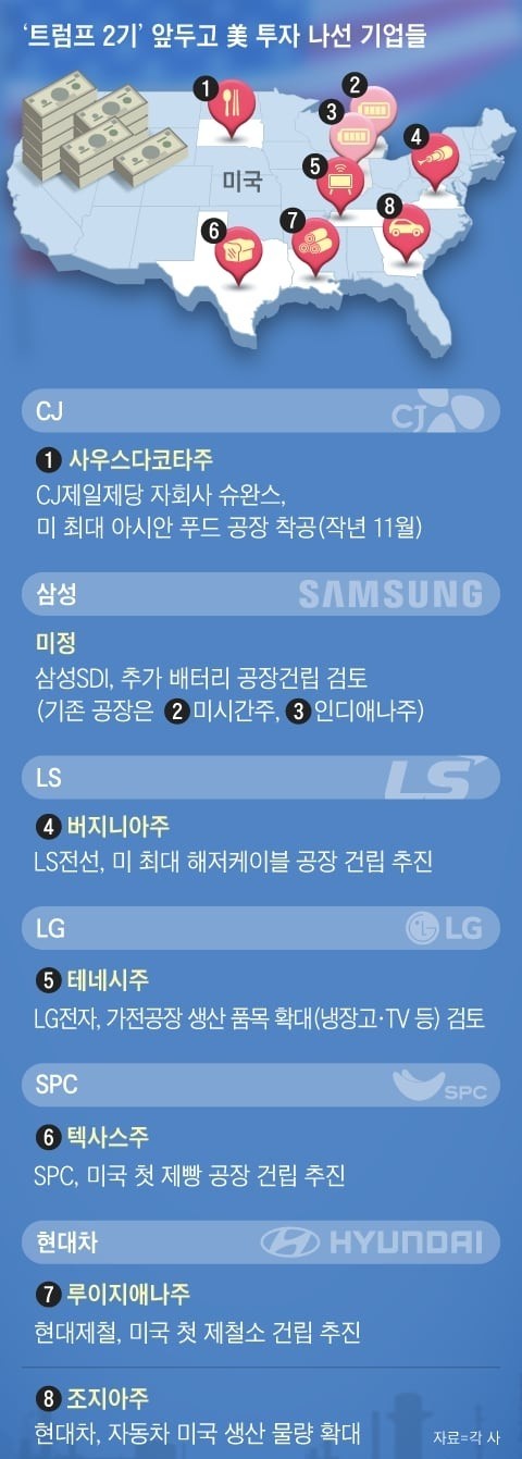 CJ그룹은 트럼프가 당선된 지 일주일여 만인 지난해 11월 13일 ‘공화당 텃밭’으로 통하는 미국 중서부 사우스다코타주에서 7000억원을 투자, 북미 최대 아시안푸드 공장을 짓는 착공식을 가졌다.