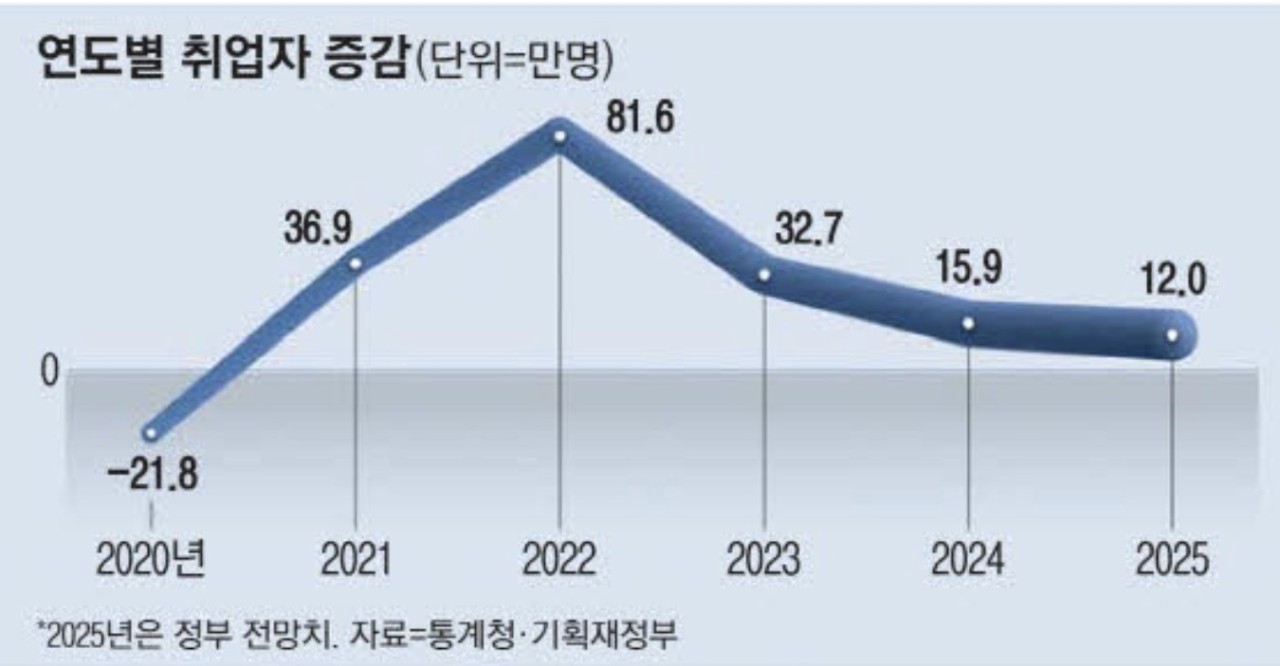 지난해 취업자 증가폭이 2023년과 비교해 절반에도 못 미쳤다. 코로나19 팬데믹이 덮쳤던 2020년 이후 최악의 성적표다.