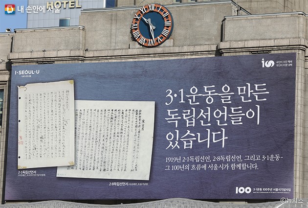 3·1운동 100주년이 한 달여 앞으로 다가온 7일 서울도서관 외벽 꿈새김판이 ‘2.8독립선언’ 내용으로 교체됐다.