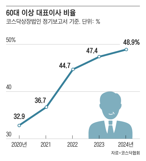 7. 평균수명 늘어나는 속도보다 CEO 고령화 속도가 더 빠르다 → 상장 기업 60세 이상 CEO 비율 2020년 32.9%에서 2024년 48.9%로 거의 절반. 4년 만에 16%Psk 늘어.(조선)▼