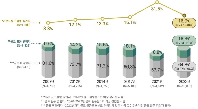 → 골프장 누적 이용객 2022년 5058만명에서 2023년 4772만명으로 감소.