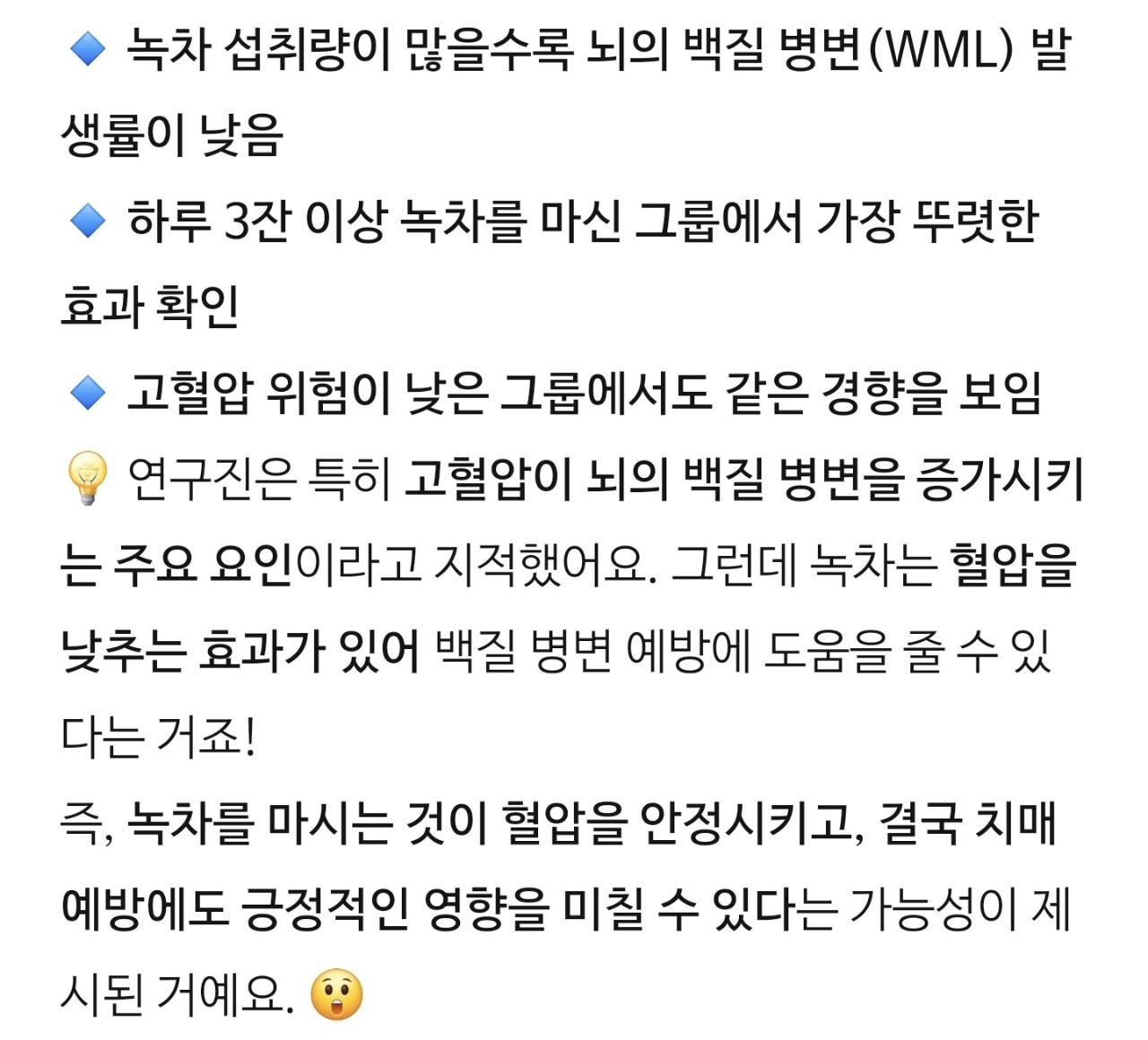 이는 매일 녹차 한 잔이 치매 위험 6% 감소시킨다는 2022년 메타 분석과도 유사한 결과.(동아)