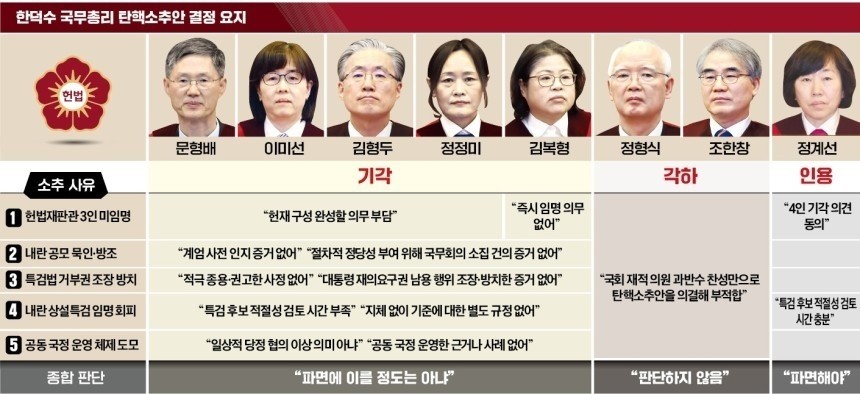 헌법재판관들 간에 인용·기각·각하로 의견이 나뉘었지만, 기각 다수 의견으로 ‘일부 위헌은 인정되나 한 권한대행을 직에서 파면할 정도로 중대한 사유는 존재하지 않는다’는 결론을 내렸습니다.