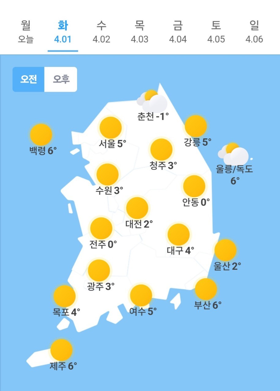 ✫춘천(⛅)➠(☀) -1℃ ~ 18℃