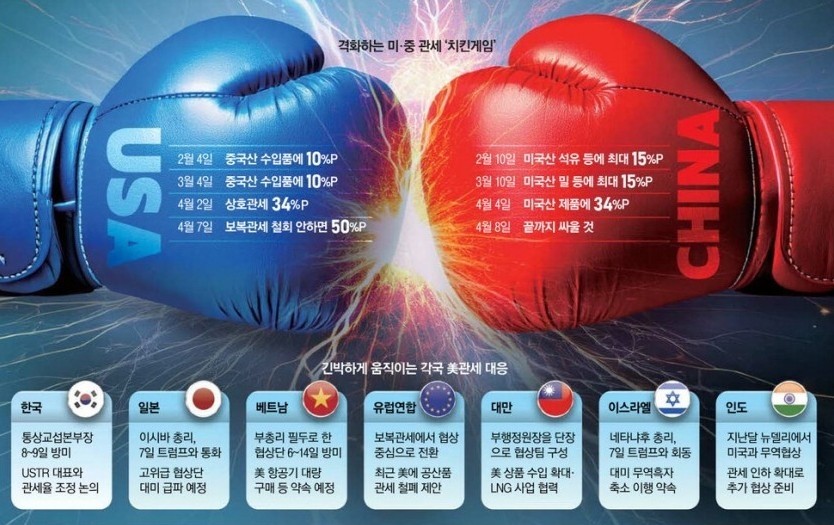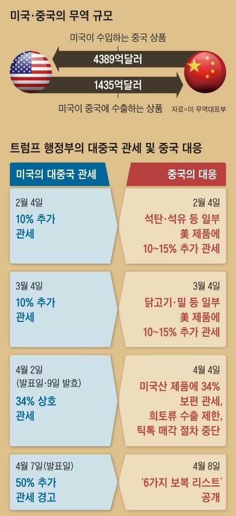 → 미국 관세 폭탄에 중국이 똑같은 보복 관세와 농산물 수입금지 등을 내놓자 트럼프, 2차 추가 관세 50% 언급.