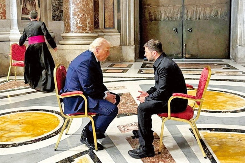 도널드 트럼프 미국 대통령과 볼로디미르 젤렌스키 우크라이나 대통령이 26일(현지시간) 바티칸에서 열린 프란치스코 교황 장례 미사 전에 독대했다.