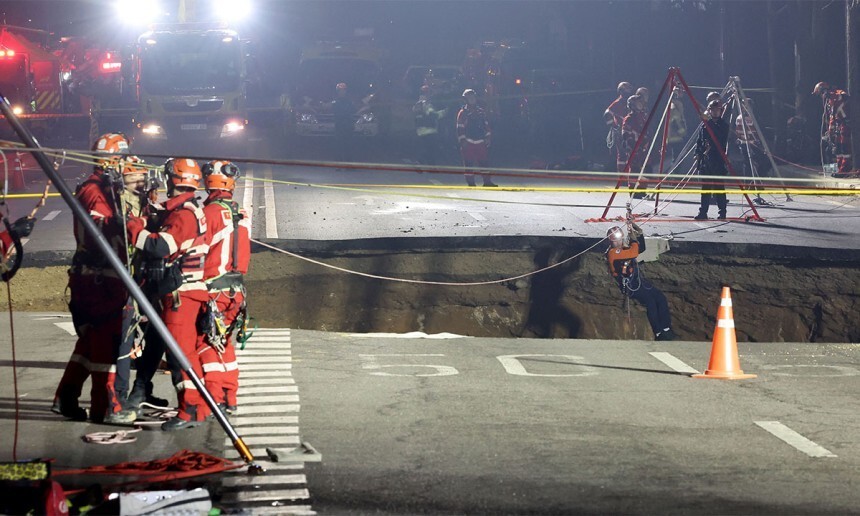지난 3월 24일 싱크홀(땅 꺼짐) 사고가 발생한 서울 강동구 대명초등학교 인근 사거리에서 소방대원이 내부 구조 작업에 나서고 있다. 연합뉴스