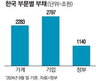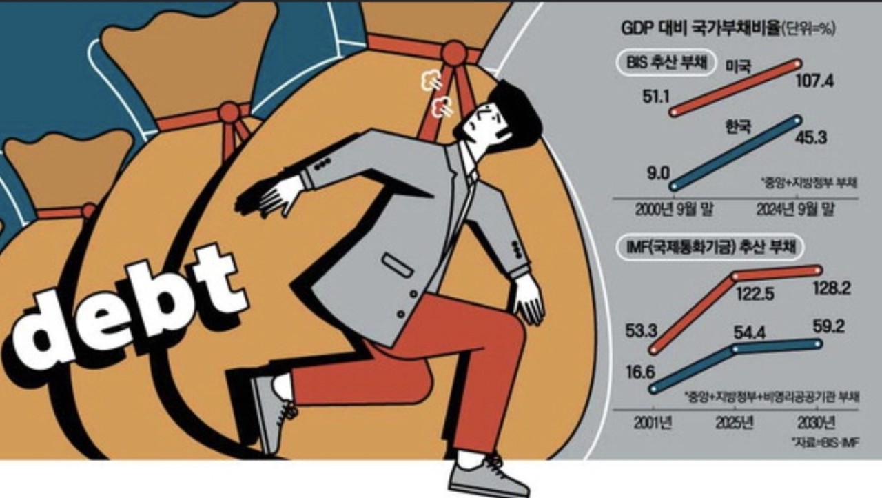 국제결제은행에 따르면 2000년 9월 말부터 2024년 9월 말까지 24년간 한국의 국내총생산 대비 중앙·지방정부 부채비율은 9%에서 45.3%로 5배 증가했습니다.