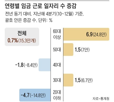 제조업, 건설업 등 수출·내수 업종의 동반 부진으로 지난해 4분기(10~12월) 봉급쟁이 일자리 수가 0%대 증가율을 보였다.