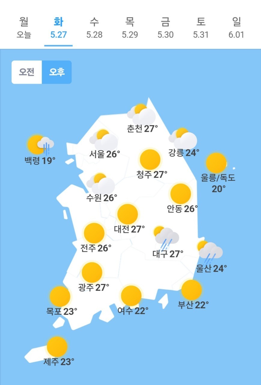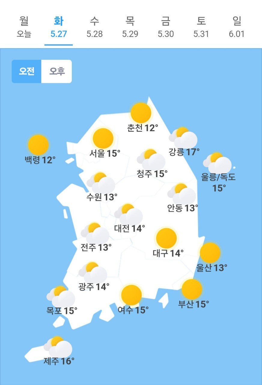 ✫춘천(☀)➠(⛅) 12℃ ~ 27℃