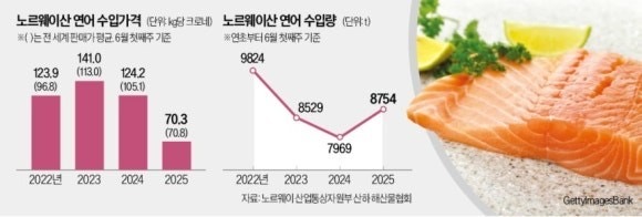 7. 연어 먹기 좋은 기회... 최대 연어 수출국 노르웨이산 연어, 1년 새 40% 이상 가격 하락 → 양대 소비국 중 미국은 지난 4월부터 연어에 15% 관세 부과로 수입 줄었고, 중국도 경기 부진으로 소비력 약화. 글로벌 연어 소비 급감.(한경)▼